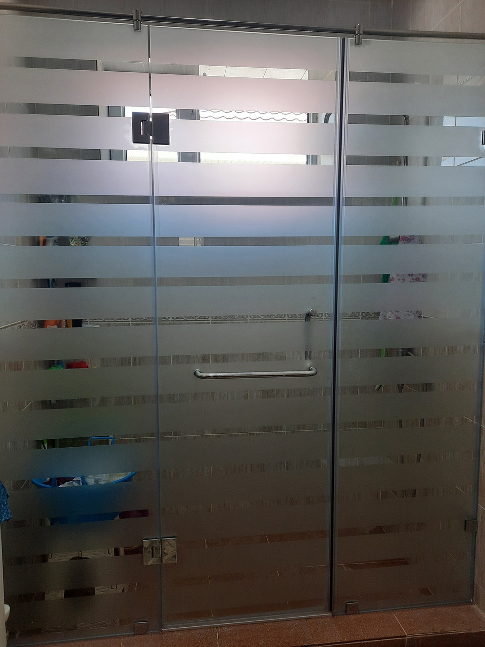 Душевая перегородка с распашной дверью из закалённого стекла толщиной 8 мм. Стекло — матовое, фурнитура —хром.